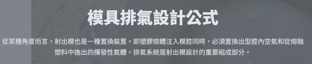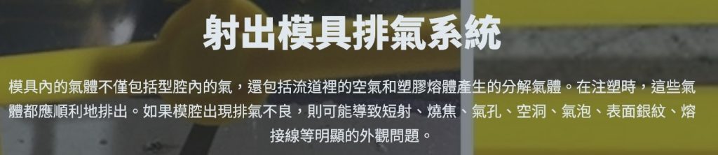 排氣系統在模具中相當重要,雖然設計不複雜,但對射出成型的正常運作至關關鍵。若模腔內空氣無法順利排出,空氣受壓會使溫度與壓力迅速升高,造成填充不良甚至燒焦。(按圖超連結文章)。