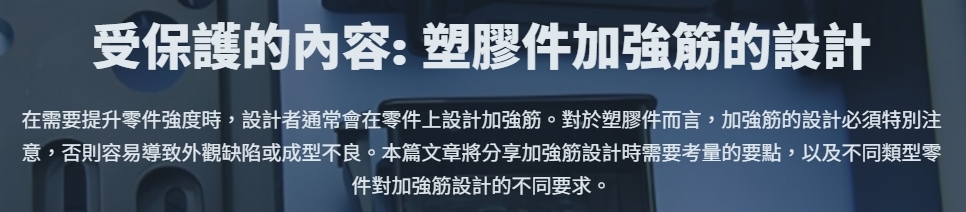 在需要提升零件強度時,設計者通常會在零件上設計加強筋。對於塑膠件而言,加強筋的設計必須特別注意,否則容易導致外觀缺陷或成型不良。本篇文章將分享加強筋設計時需要考量的要點,以及不同類型零件對加強筋設計的不同要求。(按圖連結文章)
