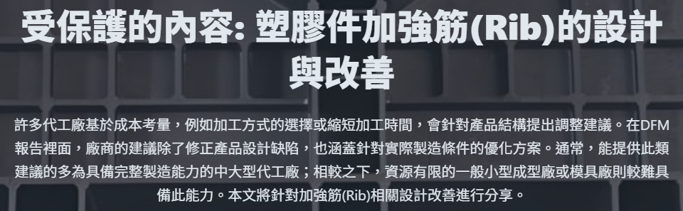 許多代工廠基於成本考量,例如加工方式的選擇或縮短加工時間,會針對產品結構提出調整建議。在DFM報告裡面,廠商的建議除了修正產品設計缺陷,也涵蓋針對實際製造條件的優化方案。通常,能提供此類建議的多為具備完整製造能力的中大型代工廠;相較之下,資源有限的一般小型成型廠或模具廠則較難具備此能力。本文將針對加強筋(Rib)相關設計改善進行分享。(按圖連結文章)