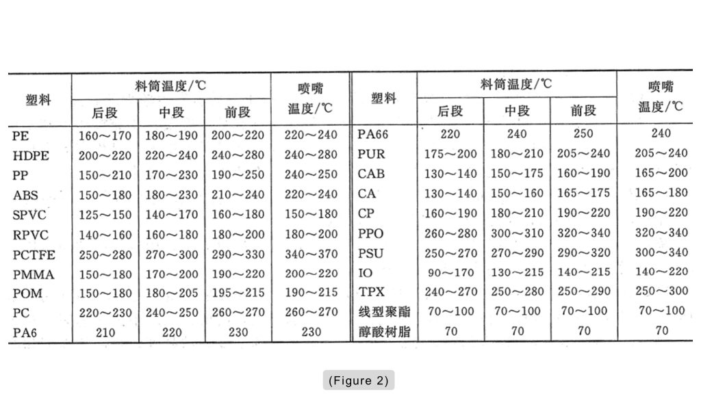 料管溫度(Barrel Temperature)是影響射出壓力與熔體品質的關鍵因素之一。射出機的料管通常設有5~6個加熱區段,每個區段可獨立控制溫度,以確保塑料原料在加熱過程中能夠逐步熔融與均勻塑化。由於不同塑膠材料具有不同的熱特性,每種原料都有其適用的成型溫度範圍,具體數值可參考供應商提供的技術資料或 (Figure 2) 所列之常用塑膠成型溫度表。