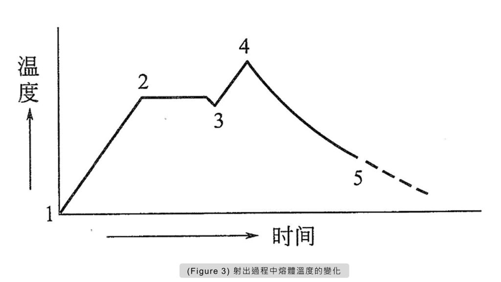 在射出成型過程中,實際的熔體溫度通常高於料管設定溫度,其差值約為10~30°C,視材料種類與射出速率而定。這是因為熔體在螺桿旋轉與高壓通過澆口時,受到剪切摩擦與壓縮作用產生額外熱量,使溫度上升,如(Figure 3)所示。