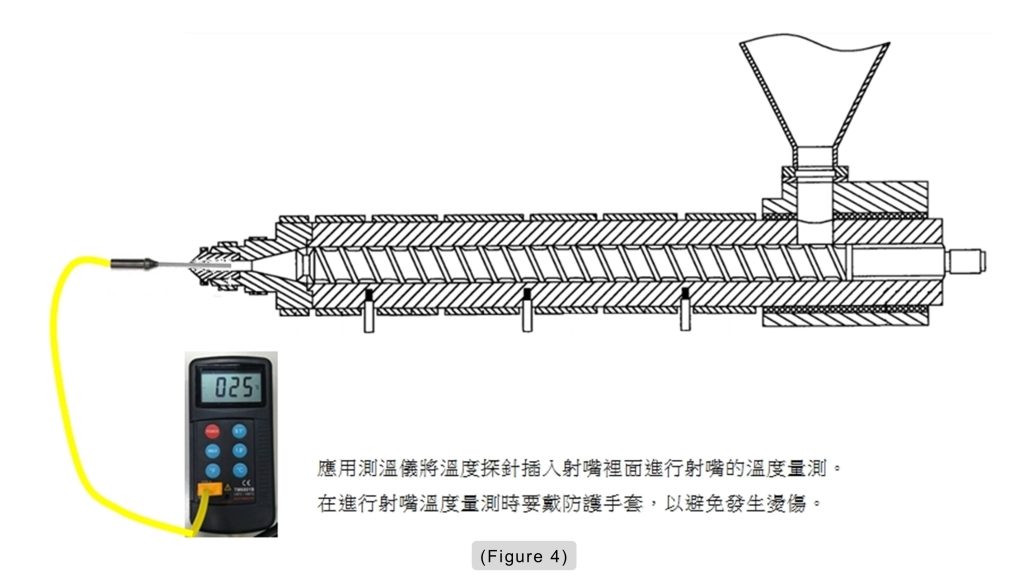 在正式量產前(或試模階段),可依(Figure 4)所示的方法量測射嘴溫度與融膠溫度,以確認射嘴實際溫度與機台設定值是否一致,進而提升後續射出過程的穩定性與製程品質。