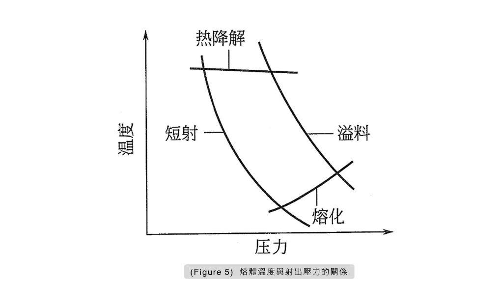 - (b) 當射出壓力較高或模具溫度較高時,則應降低射嘴溫度以防止流延與過度剪切。