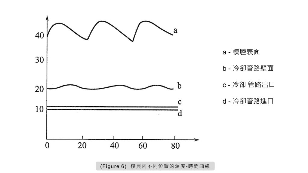 此設定可使製品表面光滑、無縮痕且外觀均勻。若製品表面帶有皮紋或轉印花紋,則應適度提高模具溫度,以改善紋理轉印效果與表面細節再現性。模具內不同位置的溫度變化可參見 (Figure 6) 所示之溫度–時間曲線。