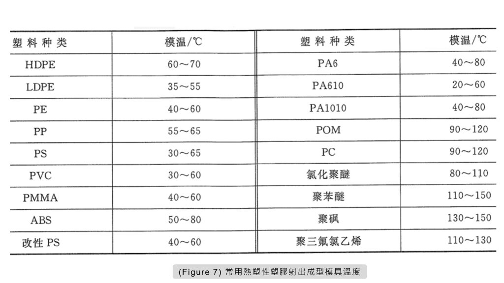 因此,結晶性塑膠(如聚甲醛POM、聚對苯二甲酸丁二酯PBT 等)通常需採用較高的模具溫度,以確保良好的結晶結構與物性表現。各類熱塑性塑膠的建議射出成型模具溫度可參考 (Figure 7)。