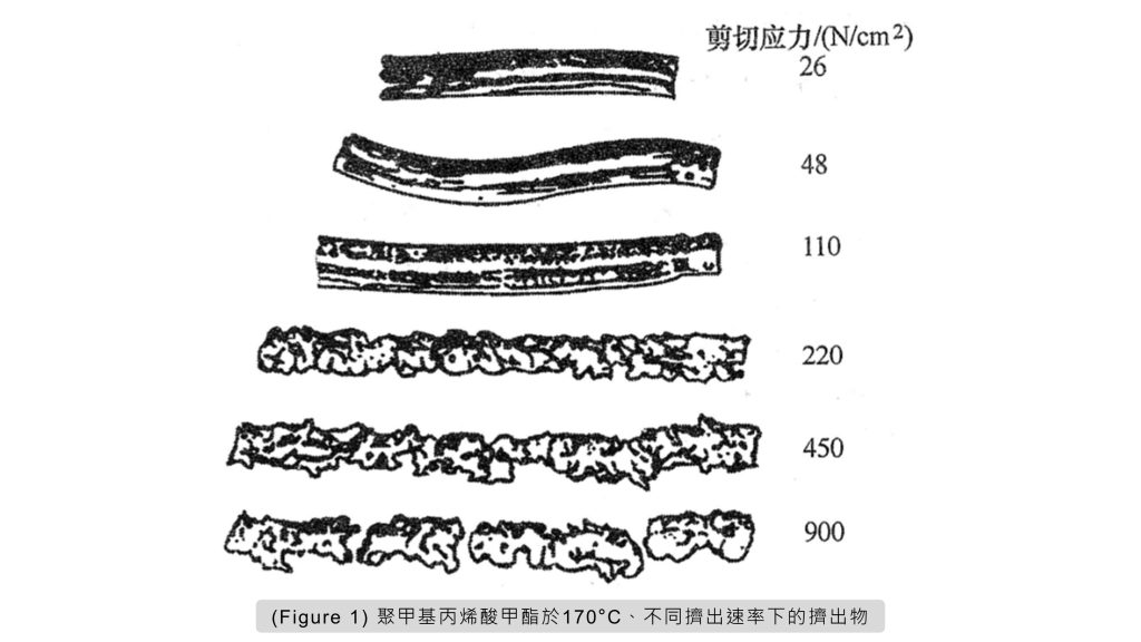 這整個從「橘皮 ➡ 竹節 ➡ 斷裂碎裂」的演變(Figure 1),就是熔體破裂典型的呈現方式。