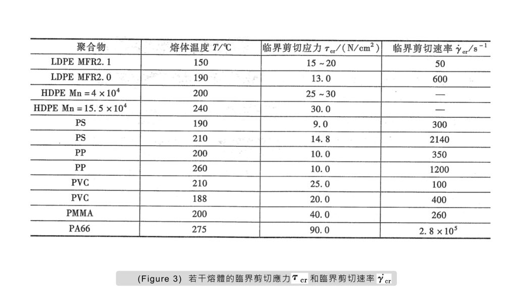 - (c) 如(Figure 3) 所示,此表為多種聚合物的臨界剪切應力值和臨界剪切速率值。