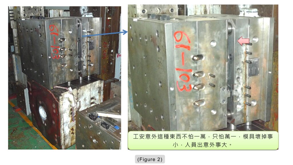 操作人員或倉儲人員若誤觸未上鎖模具,造成模具意外分離(Figure 2),極易導致壓傷或夾傷事故。