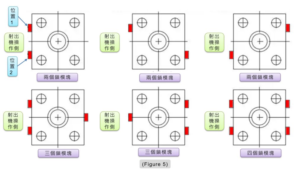 - (d) 一般小型模具裝一個就行了(射出機操作側),大型模具裝2個或多個(Figure 5) (Figure 6)。
