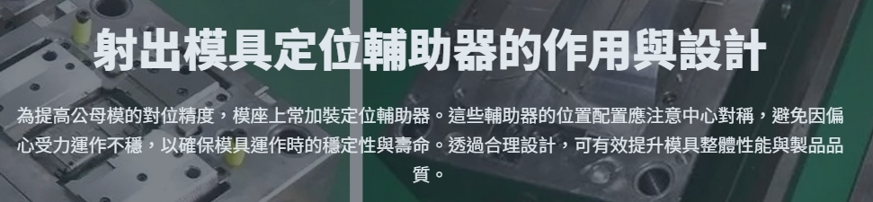 為提高公母模的對位精度,模座上常加裝定位輔助器。這些輔助器的位置配置應注意中心對稱,避免因偏心受力運作不穩,以確保模具運作時的穩定性與壽命。透過合理設計,可有效提升模具整體性能與製品品質。其相關說明可參考以下文章內容(按圖超連結)。