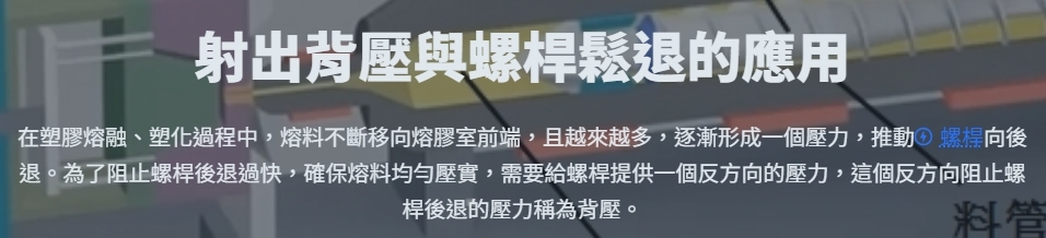 在塑膠熔融、塑化過程中,熔料不斷移向熔膠室前端,且越來越多,逐漸形成一個壓力,推動螺桿向後退。為了阻止螺桿後退過快,確保熔料均勻壓實,需要給螺桿提供一個反方向的壓力,這個反方向阻止螺桿後退的壓力稱為背壓。(按圖超連結文章)。