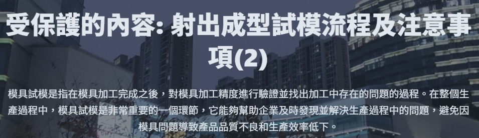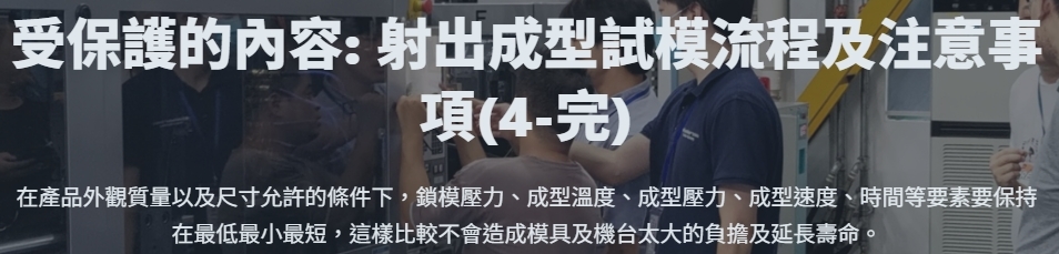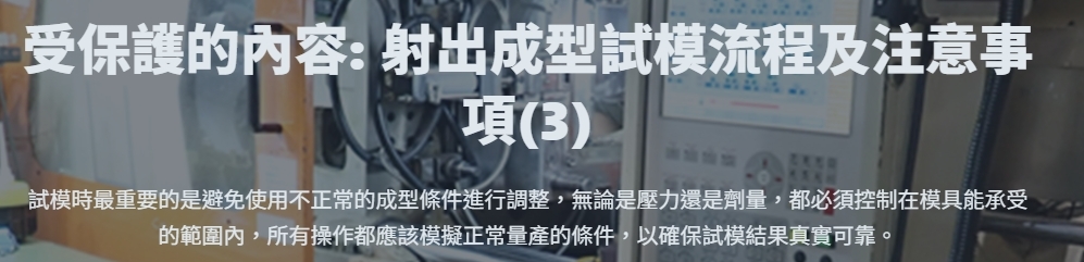 試模時最重要的是避免使用不正常的成型條件進行調整,無論是壓力還是劑量,都必須控制在模具能承受的範圍內,所有操作都應該模擬正常量產的條件,以確保試模結果真實可靠。(按圖超連結文章)。