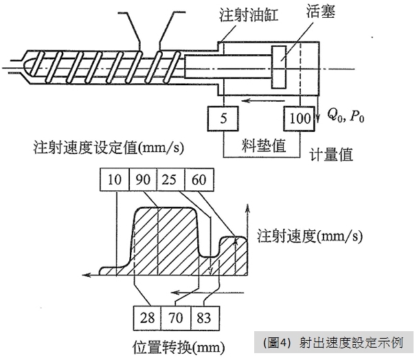 從(圖1)的對應關係判斷,當融體到達4區時,塑膠件壁厚可辨或不可變化。融體以基本充滿型腔。由於融體在3區獲得了高壓高速,因而在此階段可進行緩衝,以實現融體在型腔內的流動線速度在各部位近似一致。一般的設計原則是,可進入4區時,若壁厚增大,可減速減壓;若壁厚減小、可減速不減壓,或者可不減速而適當減壓或不減壓。總之,在4段既要使射出體現多級型腔特點又要使型腔壓力快速增大。(圖4)是根據工藝條件設置的不同速度,對射出螺桿進行多級速度轉換(切換)的一個案例。