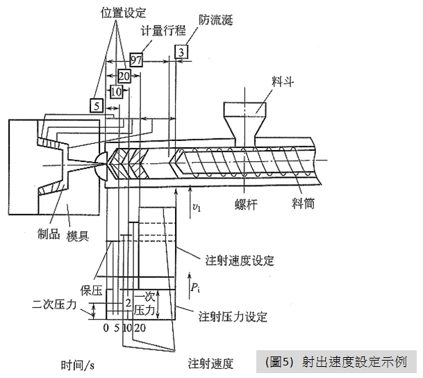 (圖5)所示是基於對塑膠件幾何形狀分析的基礎上選擇多級射出成型工藝:由於塑膠件的型腔較深而壁又較薄,使模具型腔形成長而窄的流道,融體流經這個部位時必須很快地通過,否則易冷卻凝固,會導致充填不滿型腔的危險,在此應設定高速射出。但是高速射出會給融體帶來很大的動能(註2),融體劉到底時會產生很大的慣性衝擊,導致能量損失和毛邊現象,這時必須使融體減緩流速,降低充模壓力而要維持通常說的保壓壓力(二次壓力,後續壓力)使融體在澆口凝固之前向模腔內補充融體的收縮,這就對射出過程提出多級射出速度與壓力的要求。(圖5)中所示的螺桿劑量行程是根據塑膠件用料量與緩衝量來設定的。