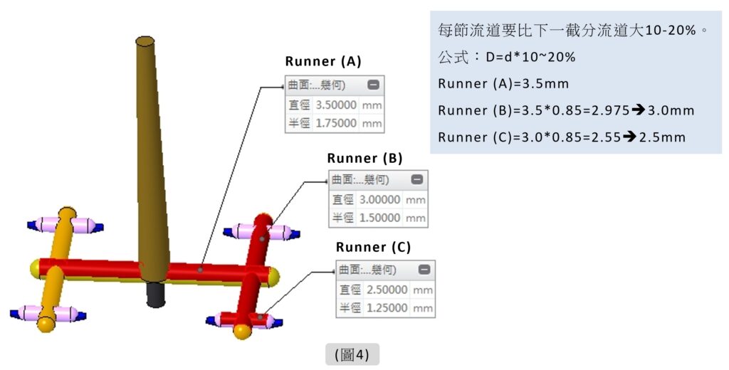 每當流道有分支,其分支流道的直徑應該小於主流道的直徑,每節流道要比下一截分流道大10-20%左右(圖4)。流道的直徑會影響射出成型品質以及材料浪費量。