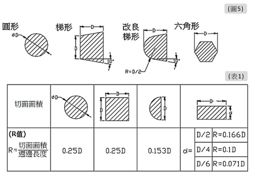 設計流道時要注意其切面形狀及大小,流道的切(斷)面形狀一般有四種(圖5):全圓形、梯形、改良梯形以及六角形。以下的影片內容是應用3D軟體去計算流道的切(斷)面積方式。