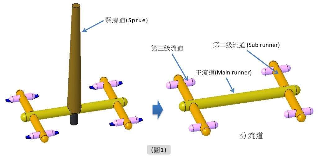 分流道(圖1)是塑膠原料從豎澆道到成形空間(成品)的主要通路。分流道的尺寸與排位會影響流道內熔體的溫度進而影響產品的品質以及材料浪費;因此分流道的尺寸與排位,應視成形材料及特性、成品形狀等作適度之增減。