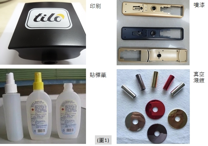 塑膠產品常會有印刷、噴漆、貼標籤、真空濺鍍等表面製程(圖1)。基本上,所有塑膠制品都可以進行這樣的加工,但其中有些材料需要進行表面處理才能做這些加工,而另外一些則可以直接進行表面製程加工。