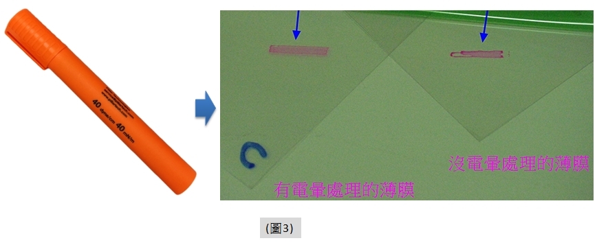 用於測定薄膜或塑件受表面處理後的效果(等離子表面處理/火焰表面處理/電暈表面處理),使用達因筆能準確地測試出塑膠薄膜之張力是否達到試筆的數值(圖3),令使用者清楚瞭解此薄膜(或塑膠材質)是否適合於印刷、噴塗、或真空濺鍍,有效地控制質量及減少因材質不合格所造成的損失。