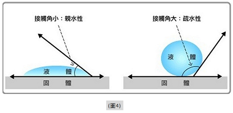達因值測量的是表面上水滴的側面角度(圖4)。如果水滴在表面形成小水珠,則表面的達因值低。如果水珠變平了,則該表面的達因值較高。