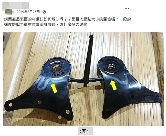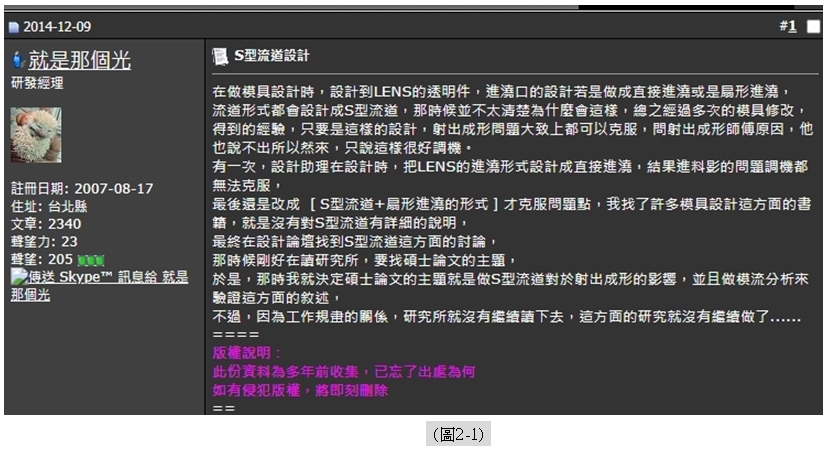 後來,當我轉成模具設計後,每當我設計Lens模具時,我依然沿用S型流道。反正就是蕭規曹隨,以前的人怎麼設計就跟著做,只要沒出問題就行了。對S型流道的影響也很少去關注。直到有一次,設計助理將Lesn模具設計成[直流道+扇形進澆(一模兩穴)]的形式,結果就是一發不可收拾,現場技師無論如何調整成型條件都無法解決流紋問題。最後改回[S型流道+扇形進澆(一模兩穴)]的形式後,才成功解決了流紋問題。那時候我正在讀研究所,正愁找不到論文主題,這次的事件給了我靈感,讓我找到了寫論文的主題(圖2-1) (圖2-2)。