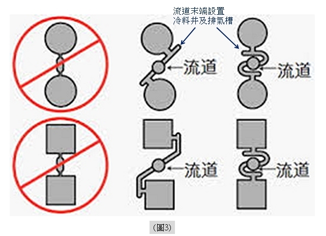 (1) 直衝型流道在塑膠射出成型過程中常常面臨一些狀況,尤其是將冷料和流道內的空氣沖入型腔時,這會對產品品質產生不利影響。為了克服這些問題,做成S型流道,通過在流道末端設置冷料井和排氣槽(圖3)來改善成型不良。