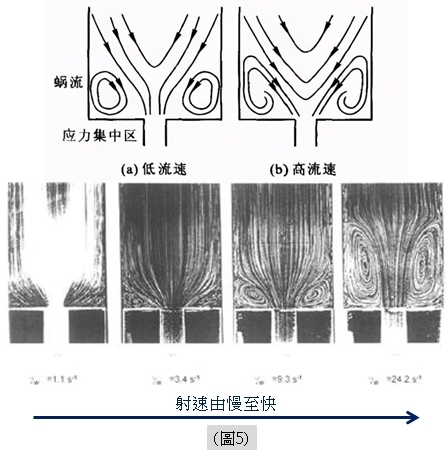 (3) 直衝型流道在塑膠射出成型過程中,由於不易控制射出時的衝力,可能對產品的外觀和性能產生負面影響。但S型流道的曲線形狀有助於減緩塑膠材料在射出過程中的速度,從而降低射出衝力。這樣一來,可以防止熔膠在型腔內形成渦流現象(圖5),這對於避免流痕、噴射痕等瑕疵至關重要。通過控制射出衝力,S型流道有助於提高產品的外觀品質。