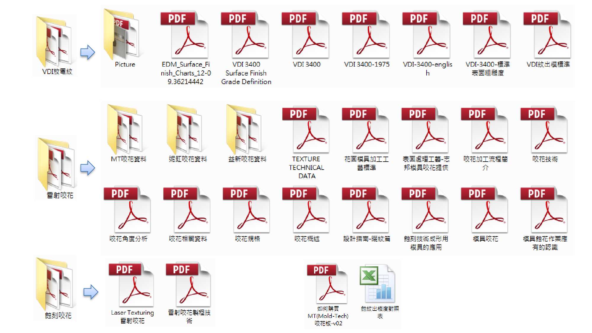 VDI(德國工程師協會,Verein Deutscher Ingenieure)制定了一系列關於放電紋的標準,其參考內容是VDI 3400。這套標準廣泛應用於模具加工與塑膠產品製造領域,是放電紋技術的重要依據。