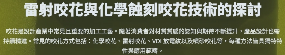 雷射咬花透過高能量密度雷射與鋼材表面進行精密反應處理,可直接雕刻出蛇皮、蝕紋、梨地等多樣紋理。此技術具有高精度與穩定性,能展現細膩效果,並依設計需求靈活調整,廣泛應用於塑膠模具、汽車零件及消費性產品外觀加工。(按圖連結文章)