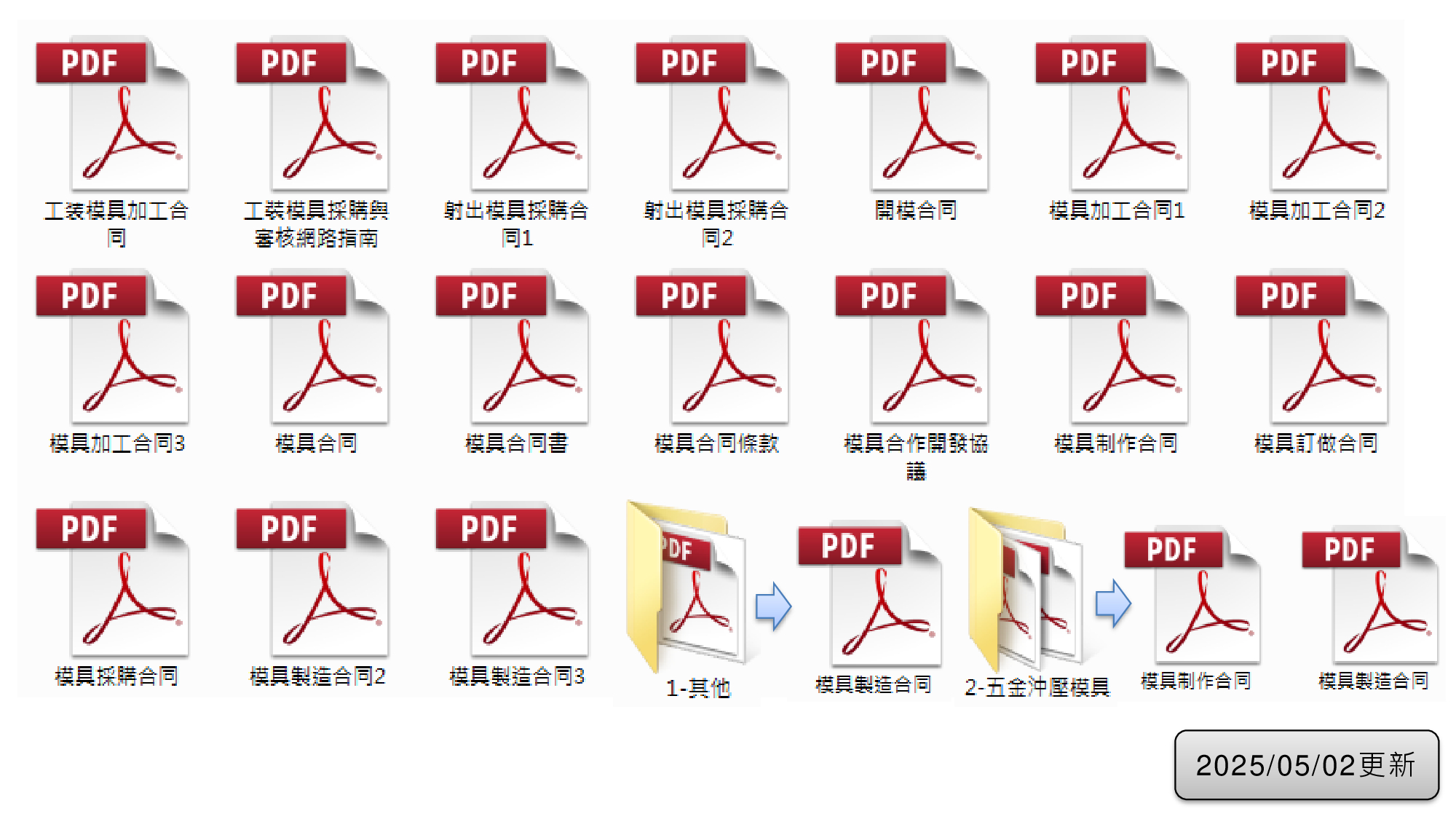 - (c) 餘款30%,在模具驗收合格後,再經過數天的使用期後,結算餘款。這種方式,基本靠近模具的設計製造使用的同步運行。