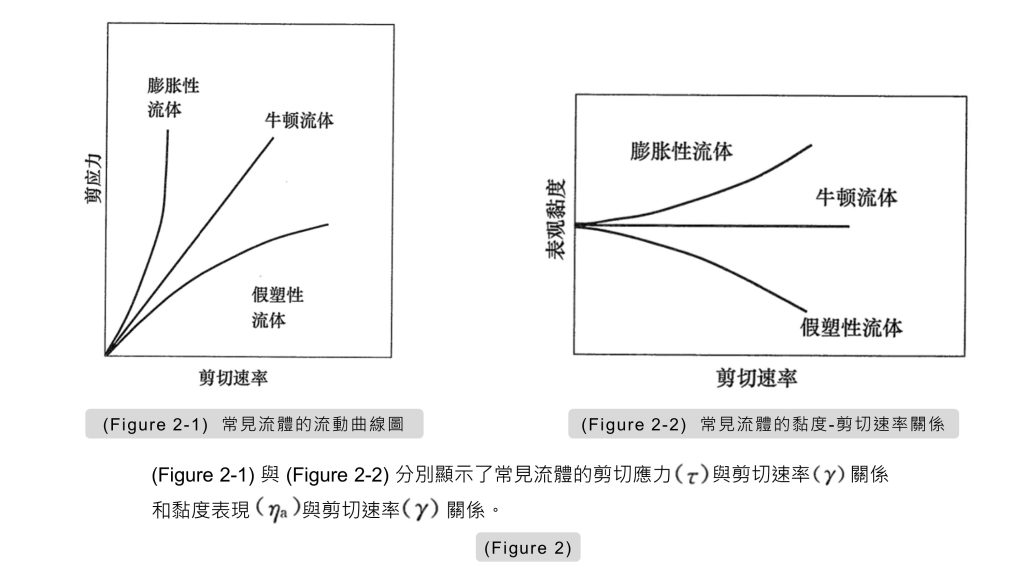 特徵:黏度會隨剪切速率改變(Figure 2)。而聚合物熔體因為分子是「長鏈+互相纏住」,多半都屬於非牛頓。非牛頓又常見兩類: