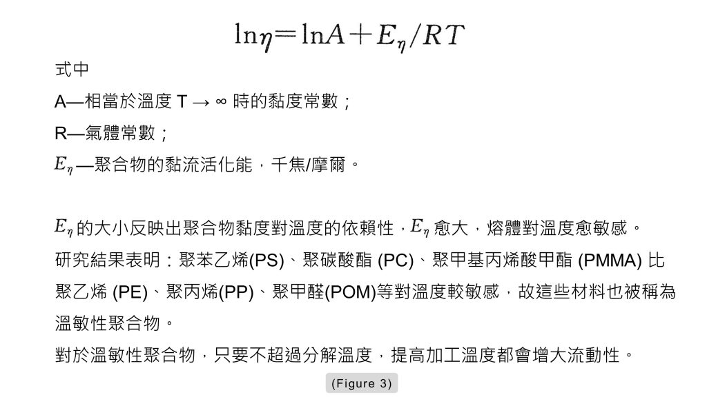 很多研究結果證明,熱塑性聚合物熔體的黏度隨溫度升高而呈指數函數的方式降低,黏度對溫度的依賴關係可用 Andrade 公式表示(Figure 3)。